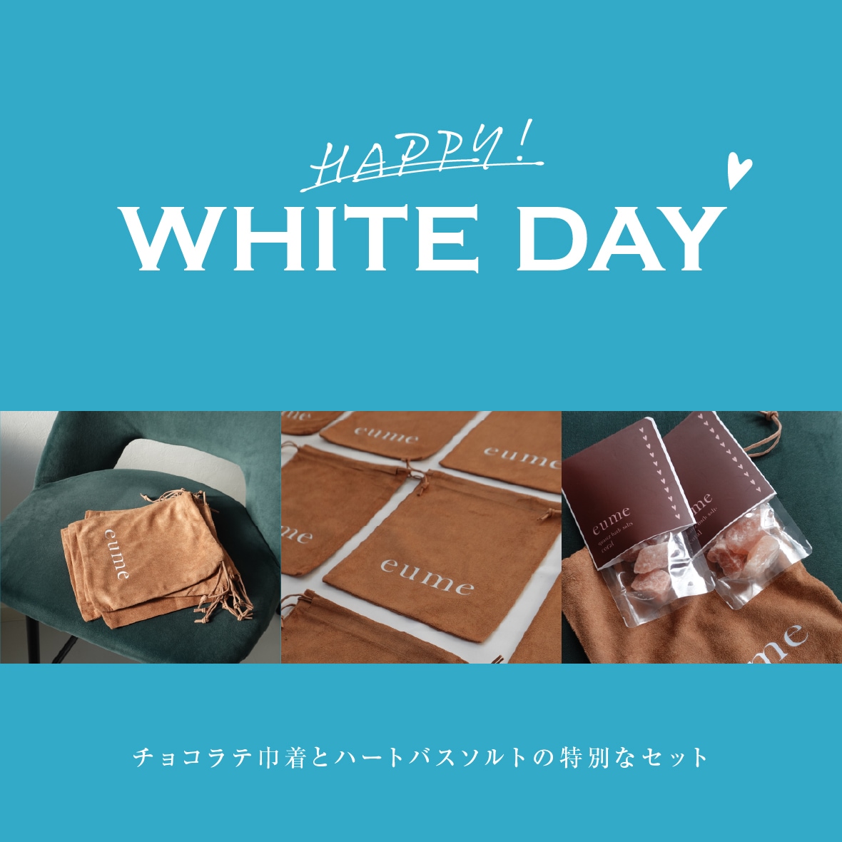 大人気のイウミークォーツバスソルト コーラル(3回分/60g)と上品なチョコラテカラーのeumeオリジナル巾着がセットになったホワイトデーセット。