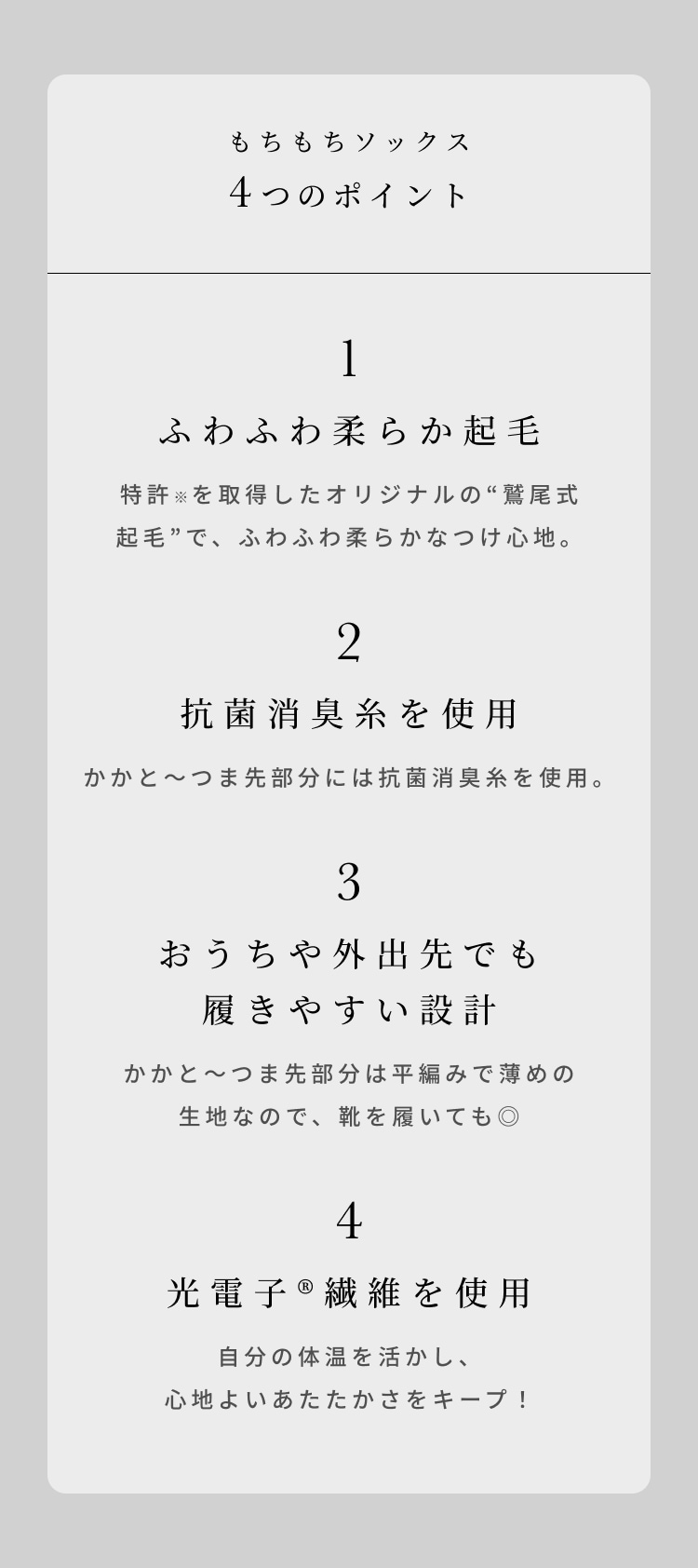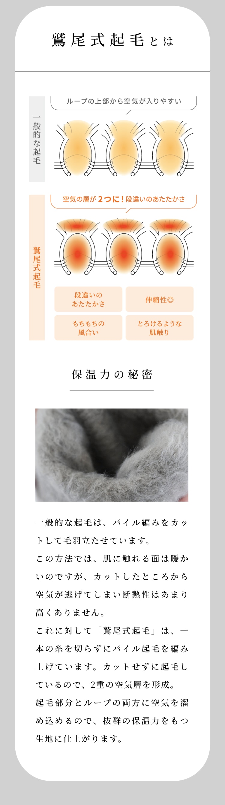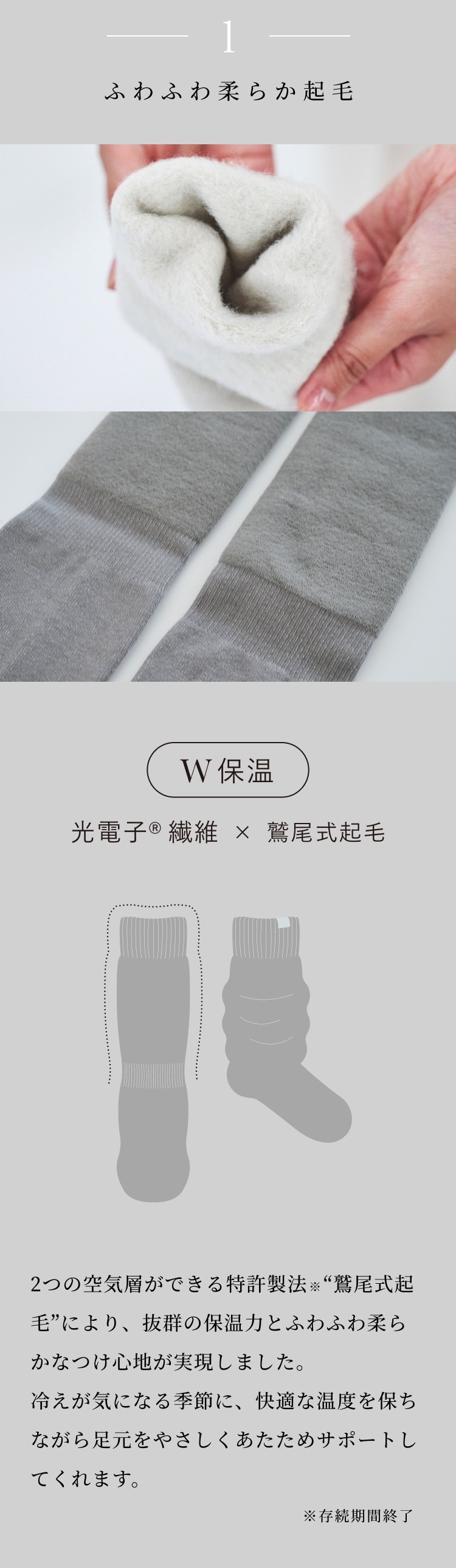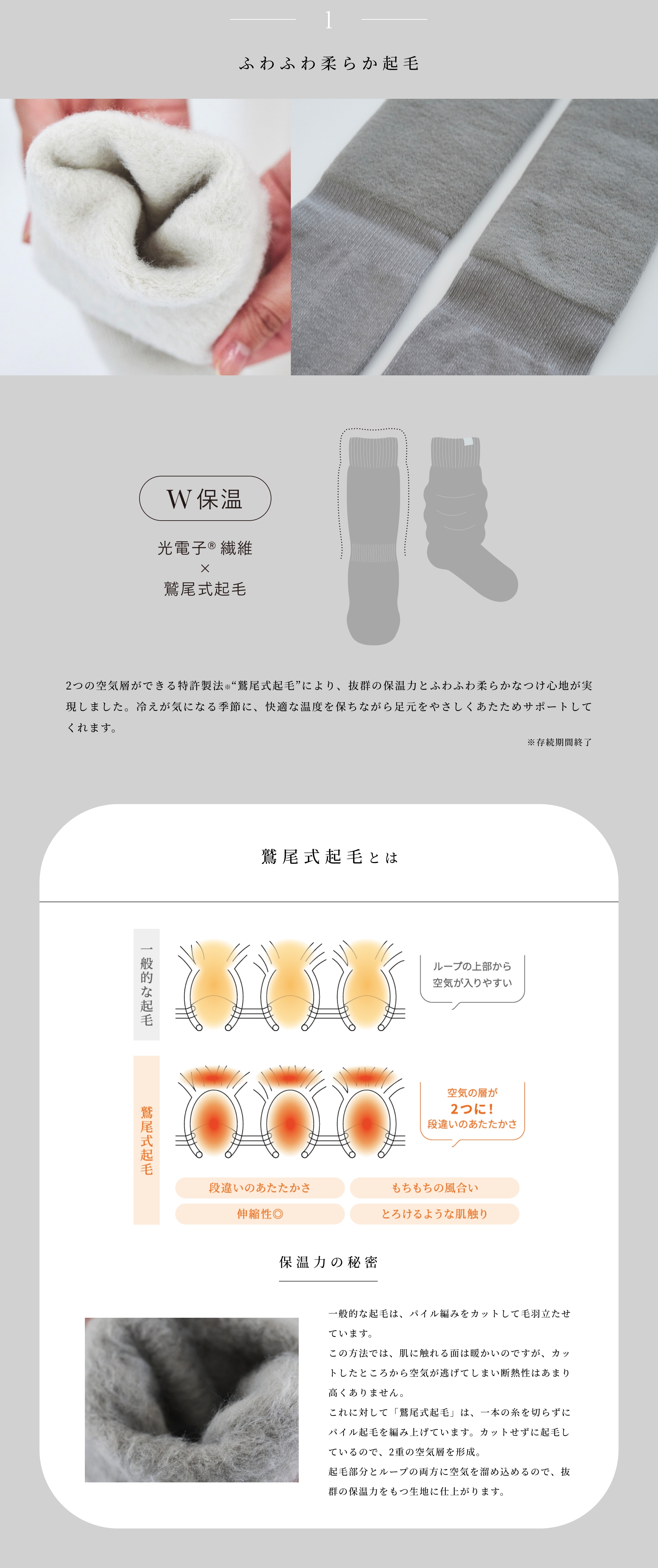 特許技術で唯一の「鷲尾式起毛」の繊維と、光電子??繊維のW保温により、もちもちふわふわな肌触りと快適な温かさが実現しました。