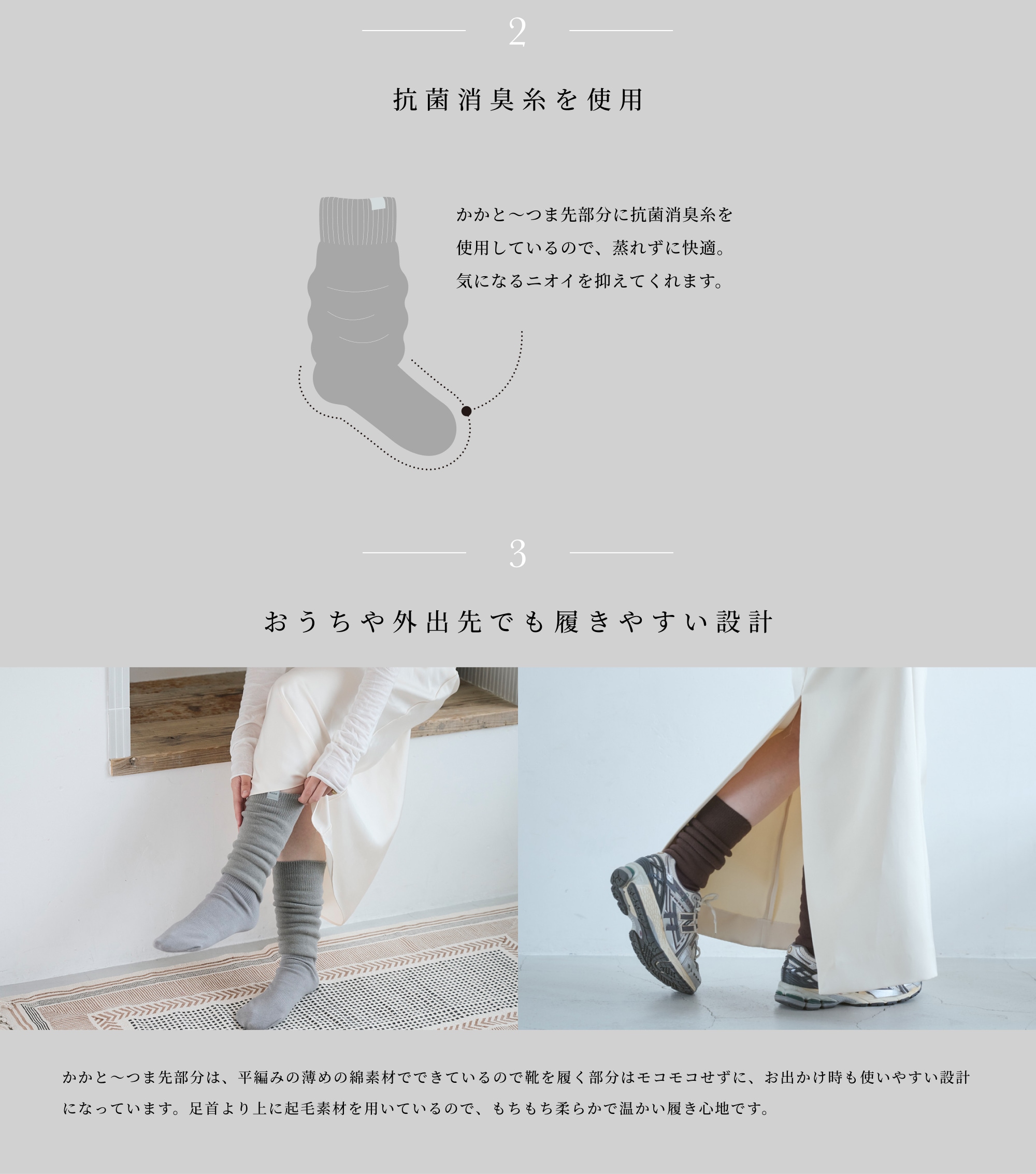 かかと~つま先部分には抗菌消臭糸を使用しており、蒸れにくいのも嬉しいポイント。平編みの薄めの綿素材でできているので、靴を履く部分はモコモコせずにお出かけ時も使いやすい設計になっています。