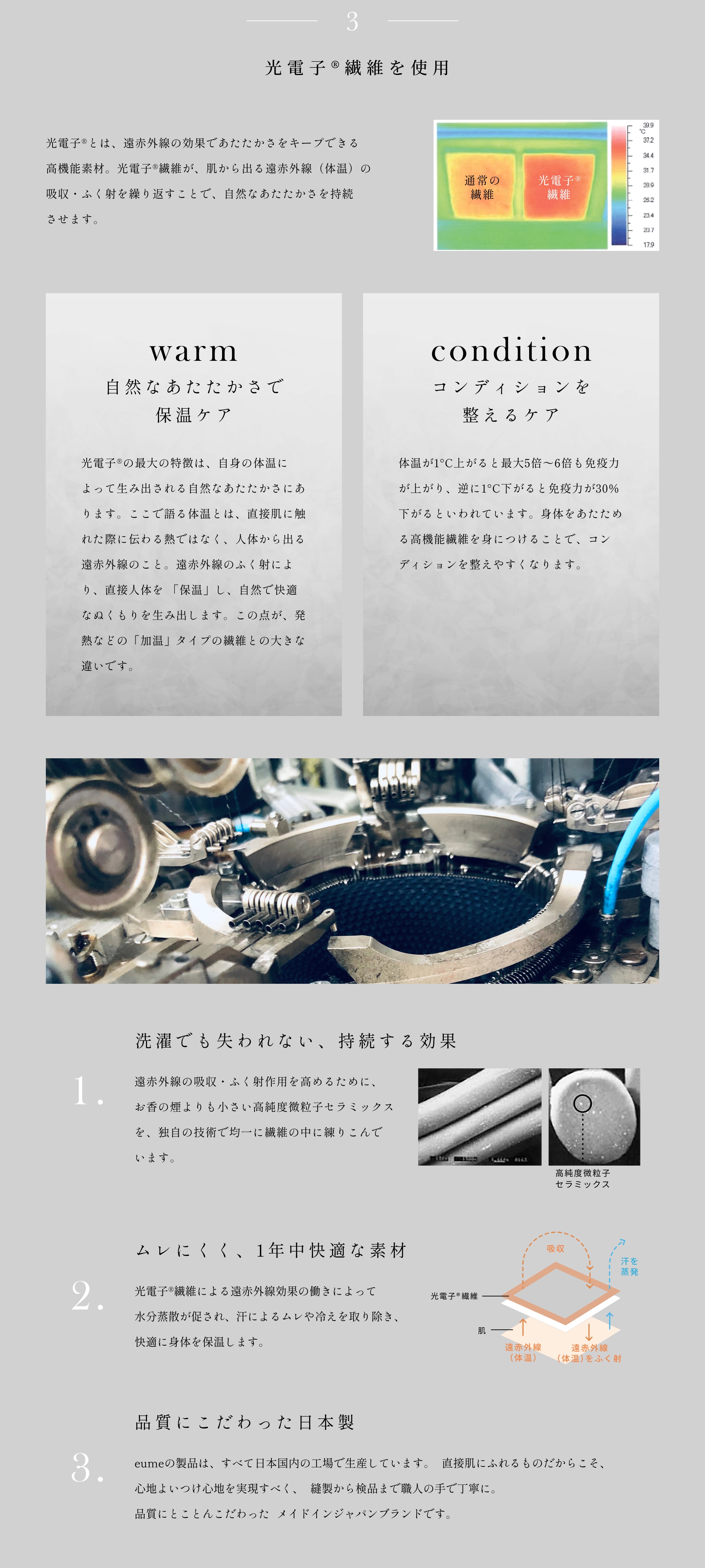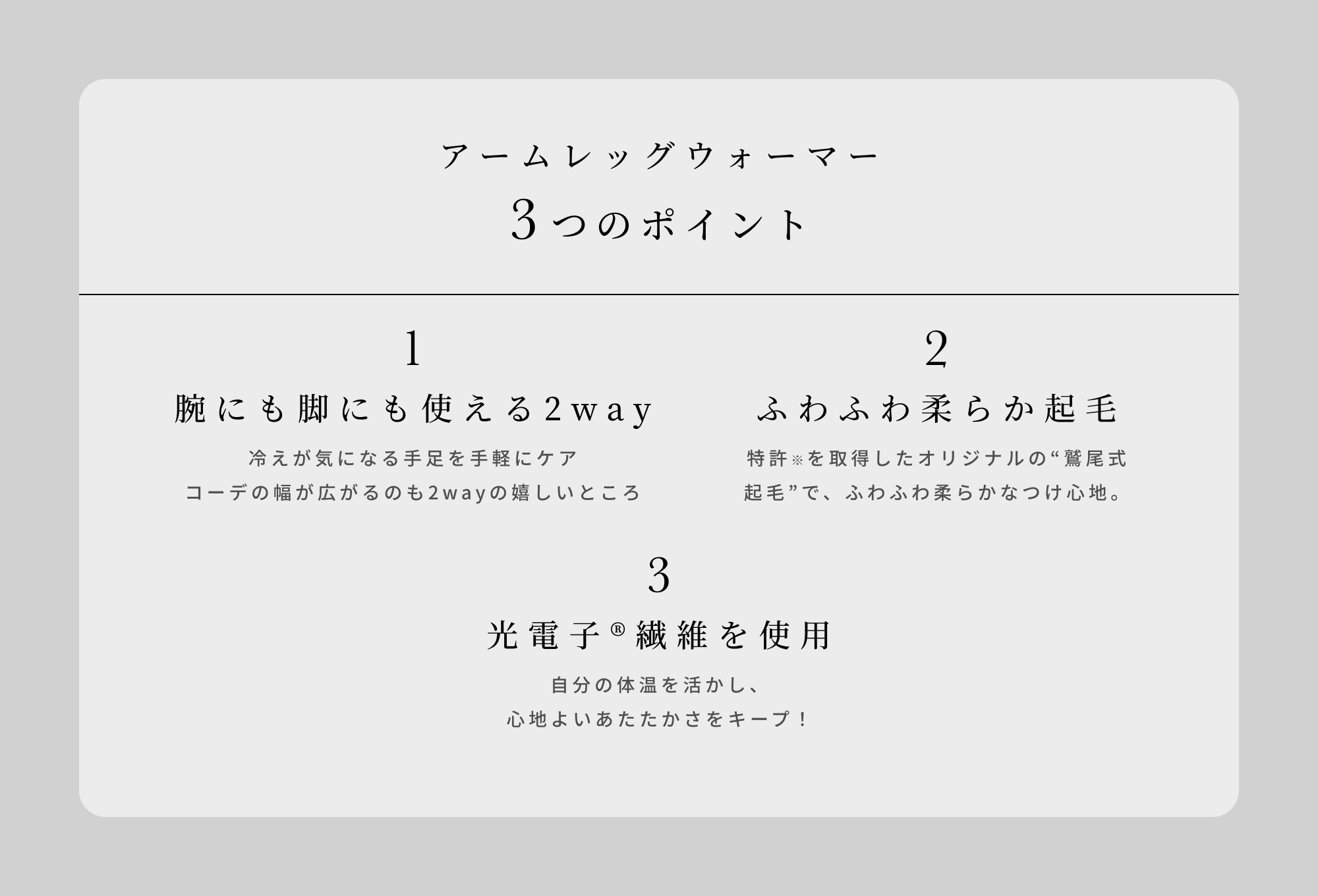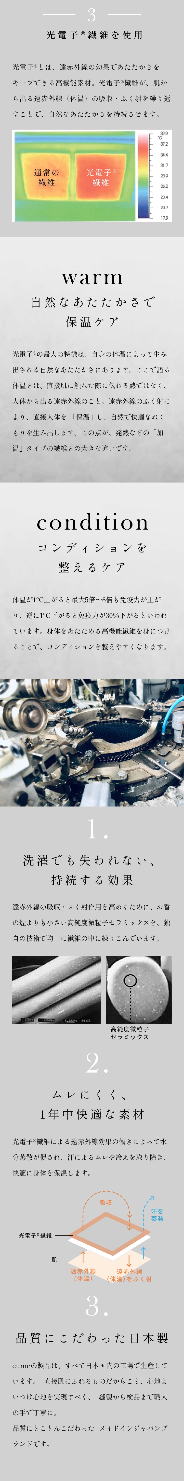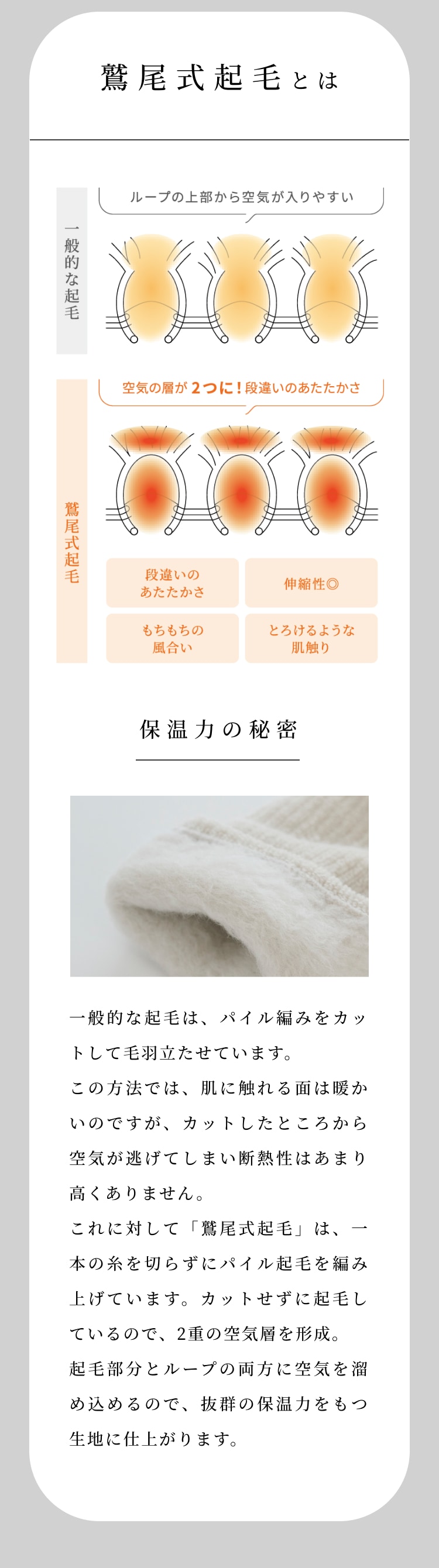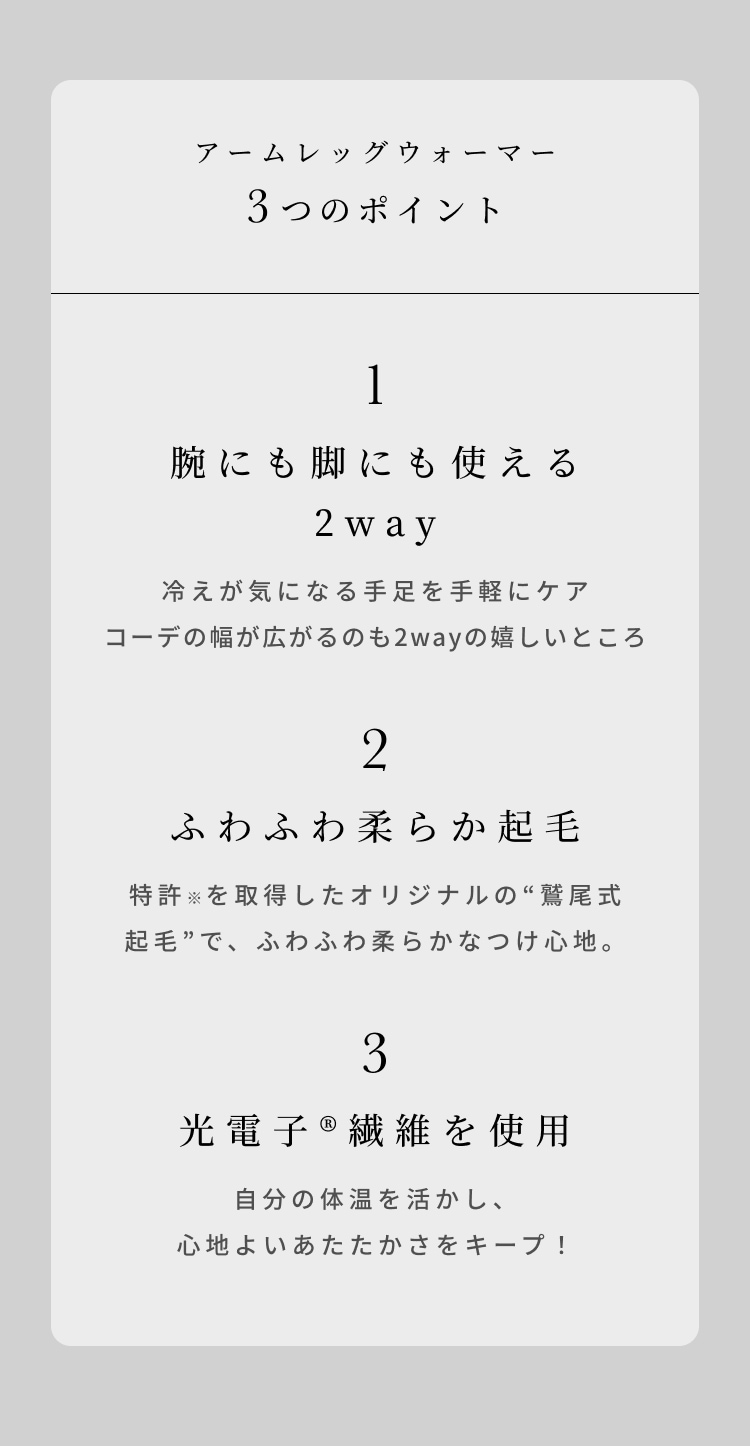 特許技術で唯一の『鷲尾式起毛』と、光電子Ⓡ繊維のW保温により、もちもちふわふわな肌触りと快適な温かさが実現しました。