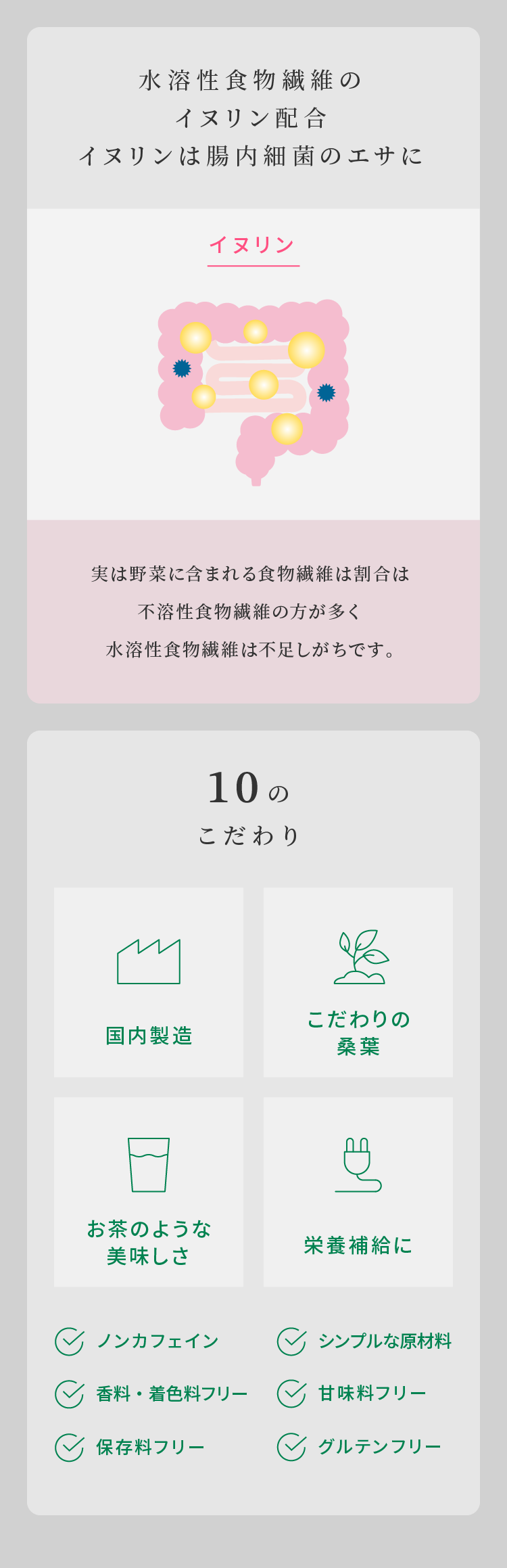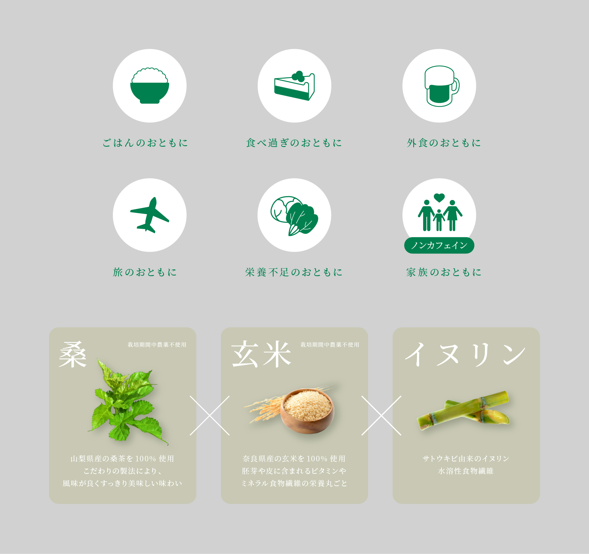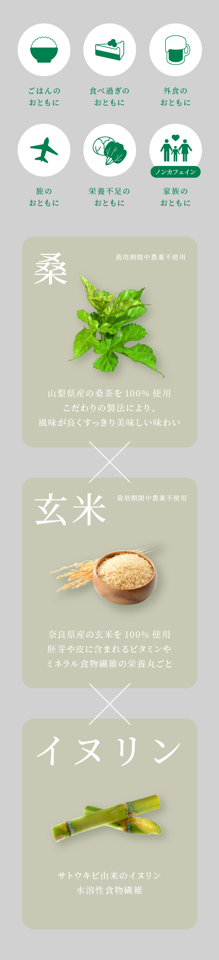 ミネラルや食物繊維が豊富な桑の葉と玄米、さらにイヌリンが配合されています。