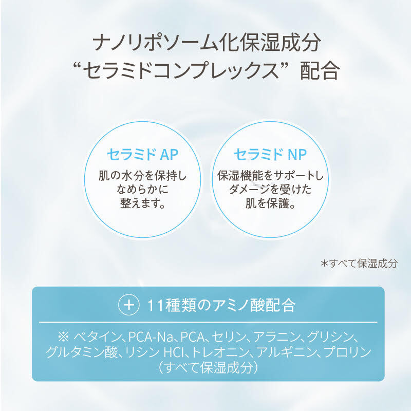 ※ベタイン、PCA-Na、PCA、セリン、アラニン、グリシン、グルタミン酸、リシンHCI、トレオニン、アルギニン、プロリンセラミドAP、セラミドNP (すべて保湿成分)